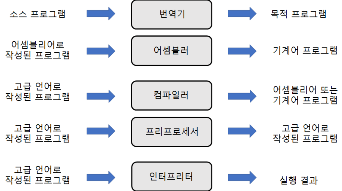 번역기의 종류는 아래의 그림과 같이 어셈블러, 컴파일러, 프리프로세서(Preprocessor), 인터프리터(Interpretor)등이 있는데, 이 가운데 가장 대표적인 번역기는 바로 컴파일러입니다.